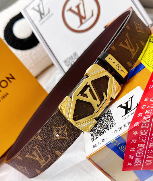 Luxury Monogram Leather Belt with Gold Geometric Buckle