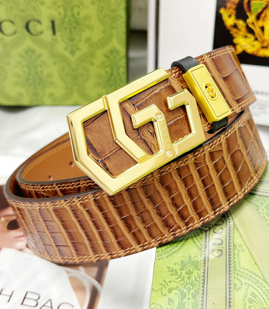 Ledergürtel mit Krokodilprägung und goldener geometrischer Schnalle