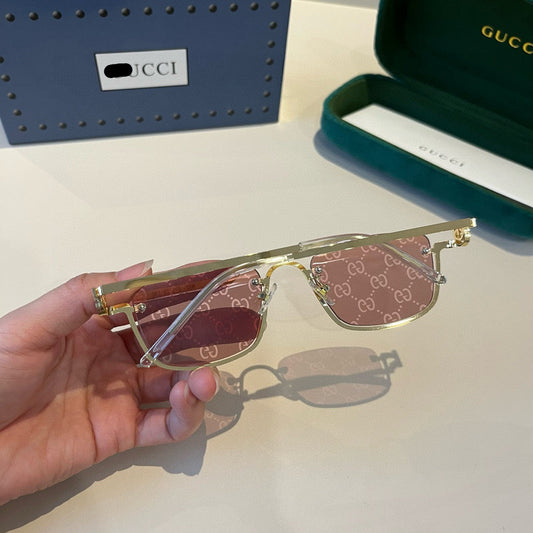 Eckige GG-Sonnenbrille mit Goldrand und rosa gemusterten Gläsern