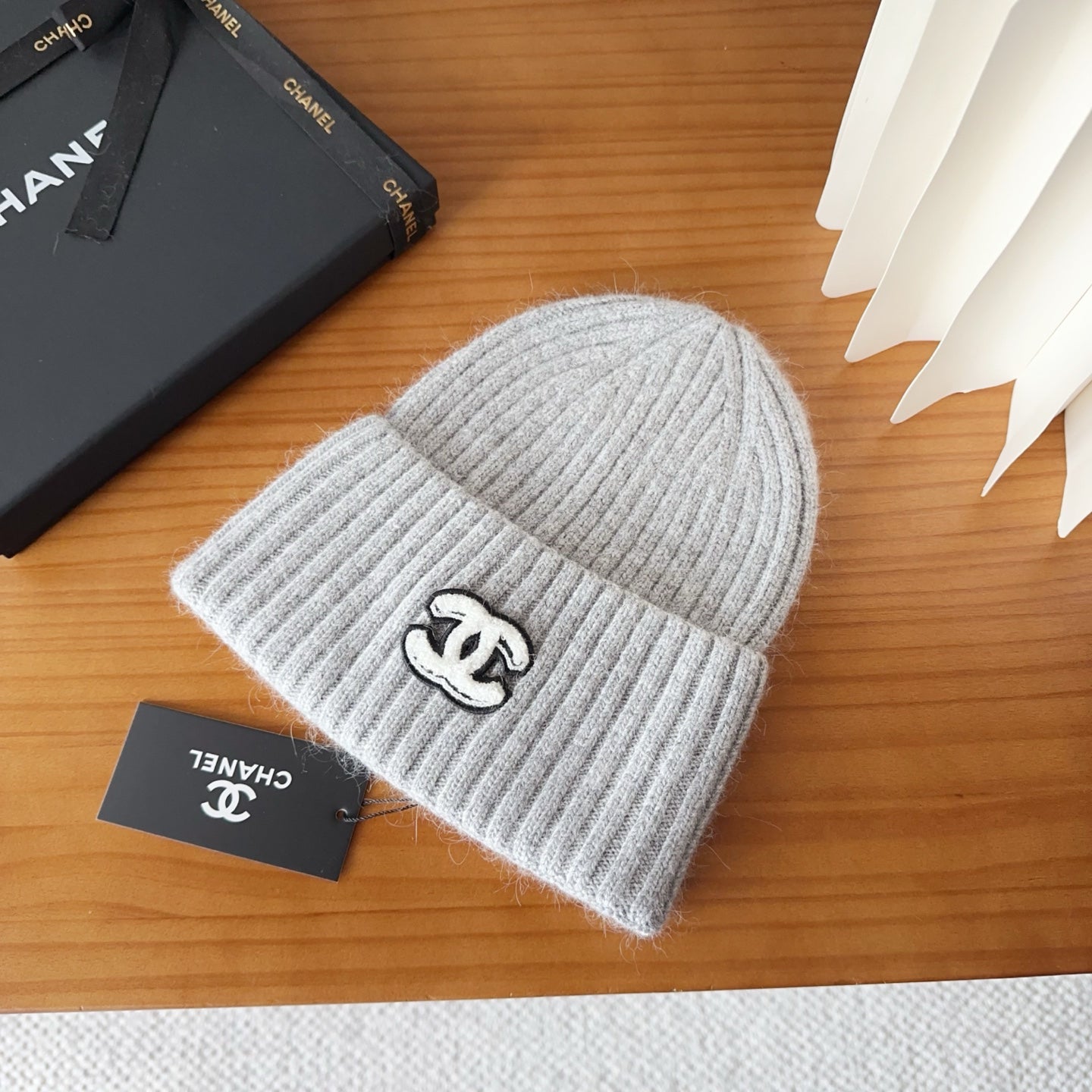 Soft heathered gray ribbed knit beanie with a sleek, iconic emblem detail — plush texture, slouchy-chic fit, perfect for adding understated luxury to cool-weather looks.