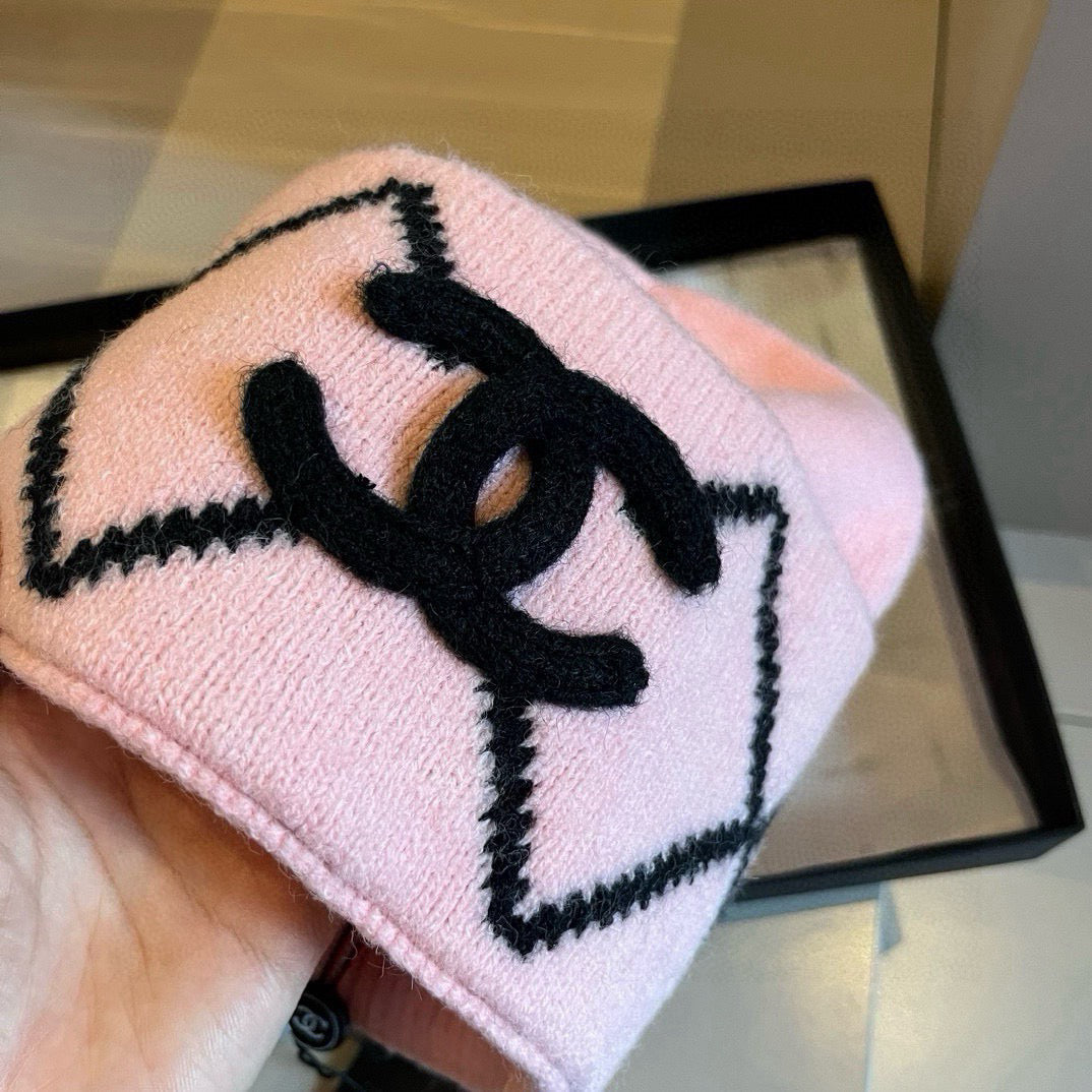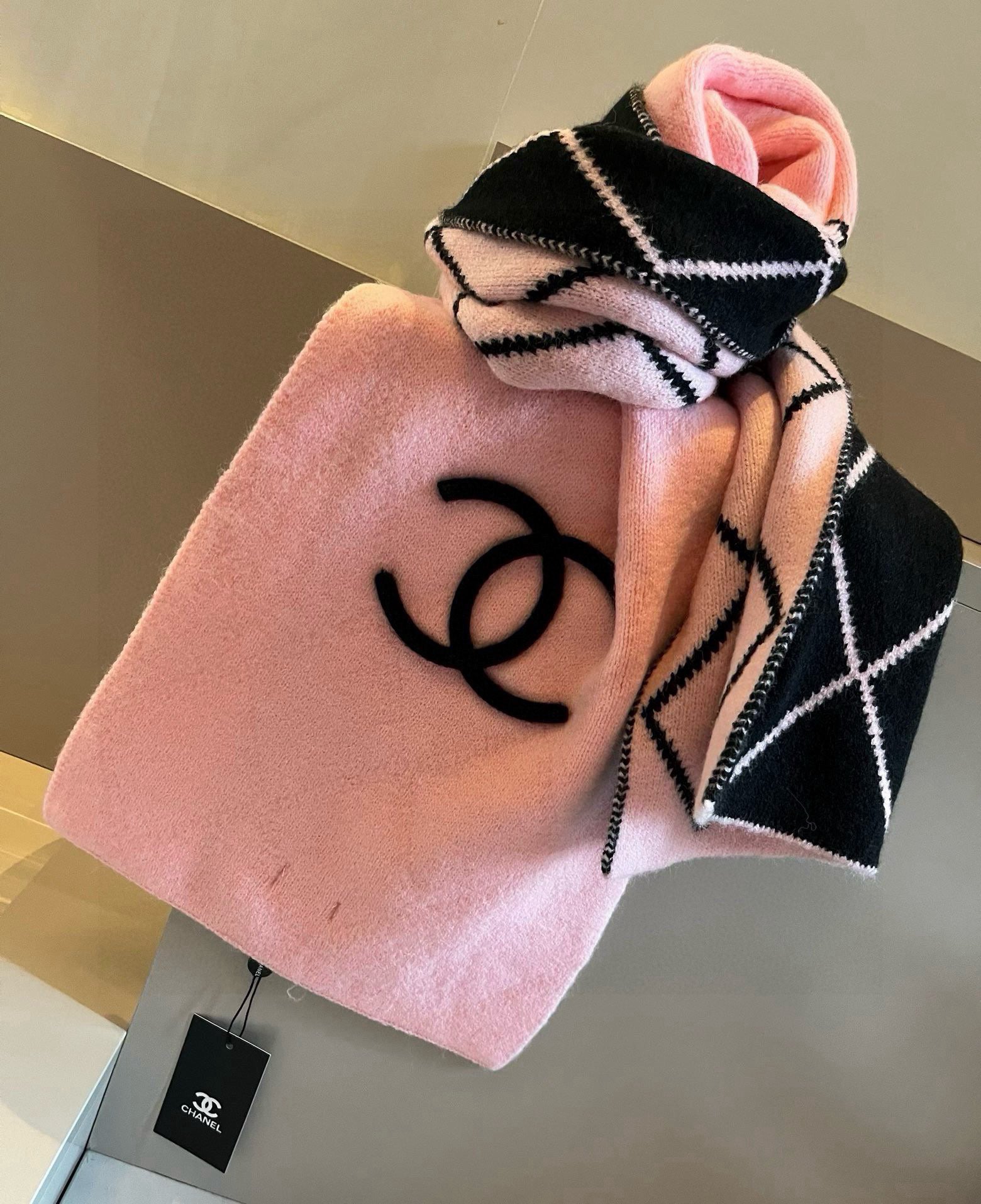 This is a beanie and a scarf set in pink, featuring the iconic black interlocking "CC"