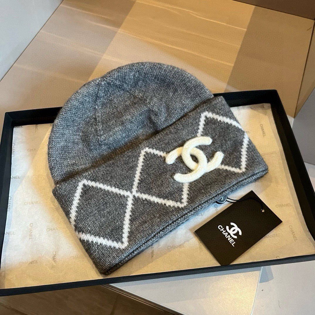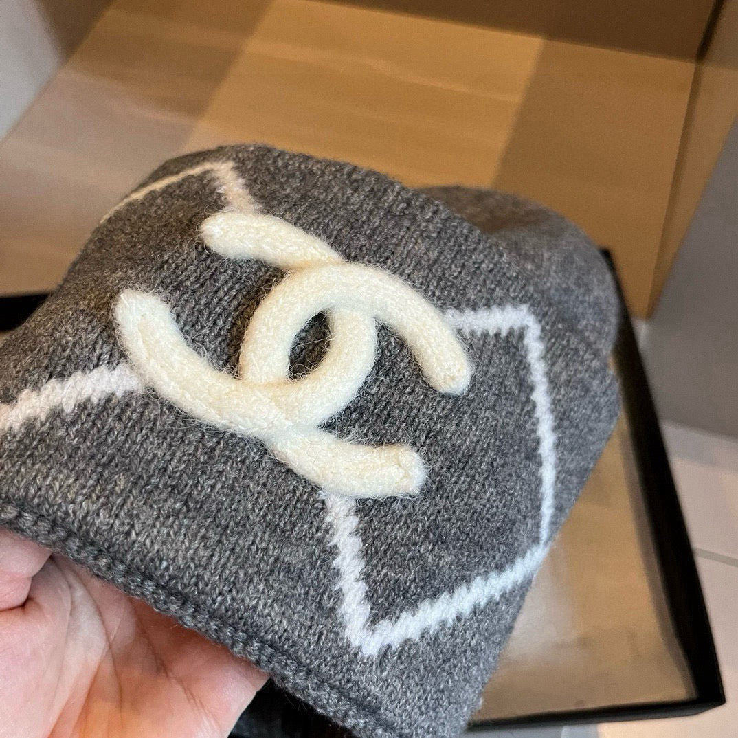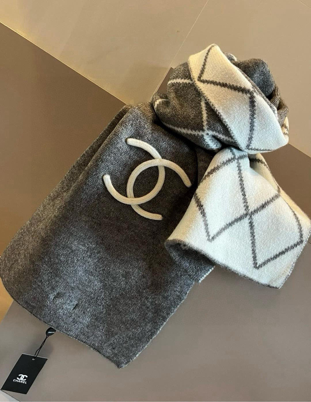It’s a knitted winter accessory set consisting of a grey beanie and a matching scarf, both decorated with a white stitched emblem on the front.
